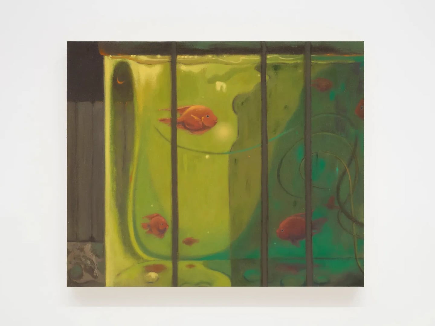The exhibition constructs a fragmented world built on boundaries and magic realism. In Cheng’s visual lexicon, windows, aquariums, fences, and the very surface of the canvas are not merely frames but psychological thresholds that we constantly negotiate. In Wandering in Moss Traces (all works 2025), a soft, tangible glow emanates through the glass of a moss-covered aquarium, itself viewed through the bars of a fence. The work originates from a memory of passing through the streets, where the artist's gaze accidentally caught the deep interior of an old building’s entrance. The fence and glass become a double barrier, rendering the vibrant orange fish inside both luminous and utterly lonely—mirroring the painter and the viewer alike.