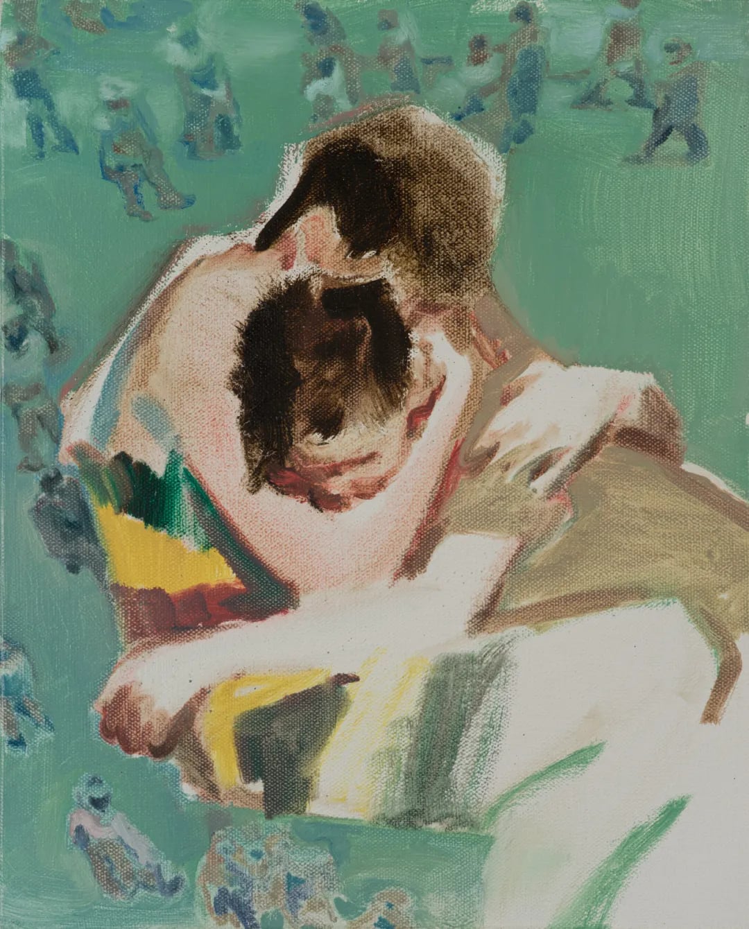 Overlapping and entangled limbs evoke a sense of revelry. Yet, the artist does not seek to capture the purely ecstatic joy of the Dionysian moment. Instead, through intense and extreme individual emotion, he reflects a more profound solitude. In these works, tightly intertwined bodies are set against an endless crowd viewed from above, suggesting that momentary conflicts are tempered by the cool detachment of a larger perspective.